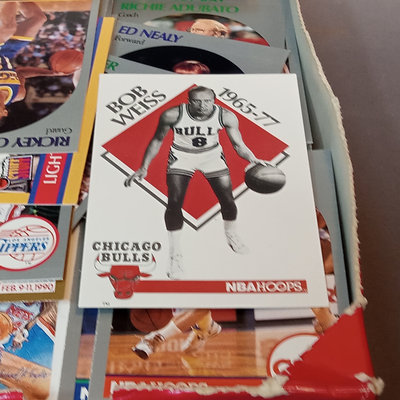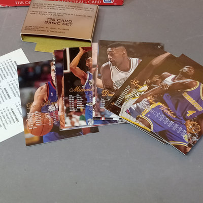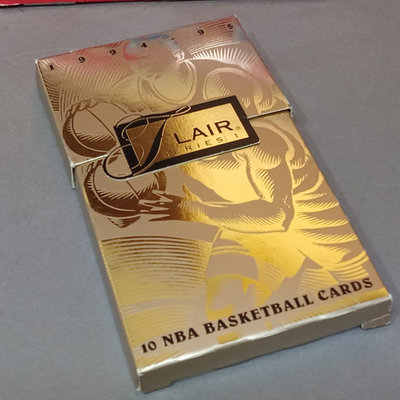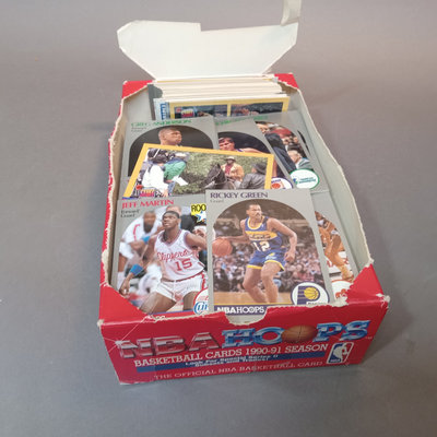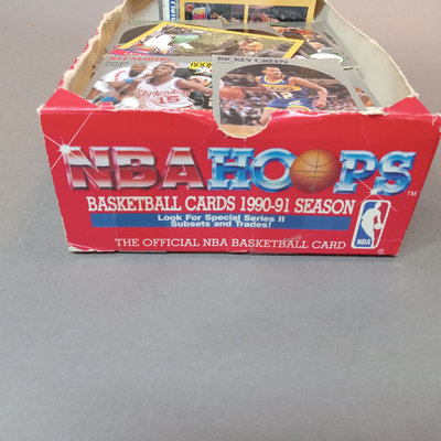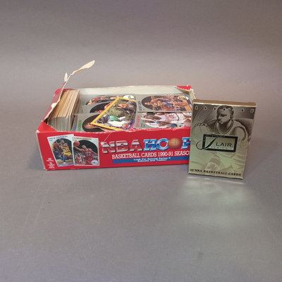 NBA Hoops Basketball Cards, 1990-1991 Season, n counter display box with many (uncounted) unsorted cards. Flair Series 1 1994-95 cards. 2 pieces.