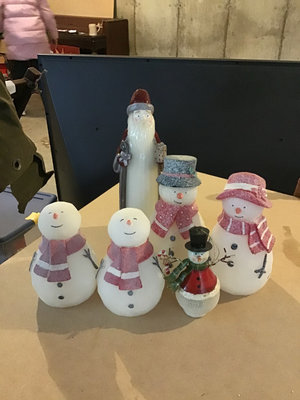 A group of decorative holiday figurines including multiple snowmen with scarves and buttons, a Santa figure, and a small snowman character.