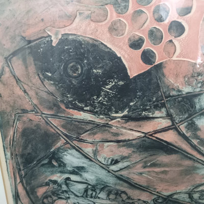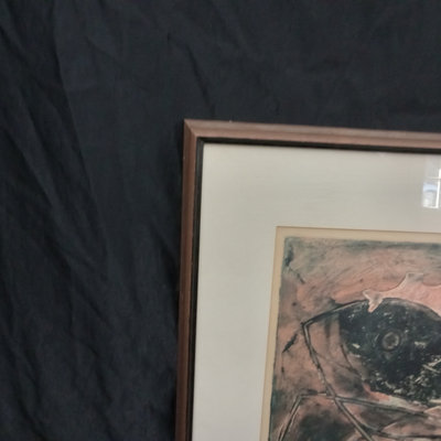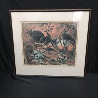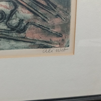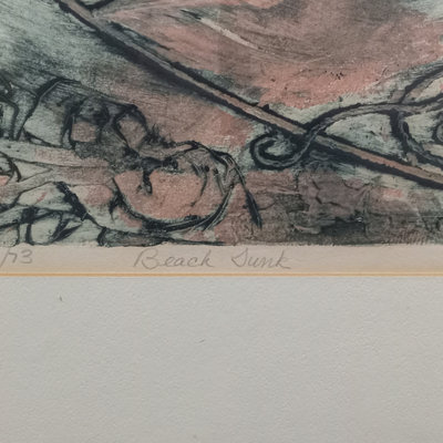 Alice W. (Emery) Enge (American contemporary), often signing her work as Ali or Ali Web, many of her works were woodcut or linocut. Beach Junk, Imp. Artists Proof 2/13/73, Ali Web. Art 12.5x15, frame 19x21.25. 1 piece.