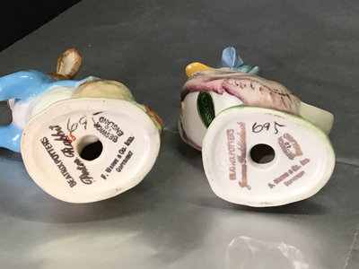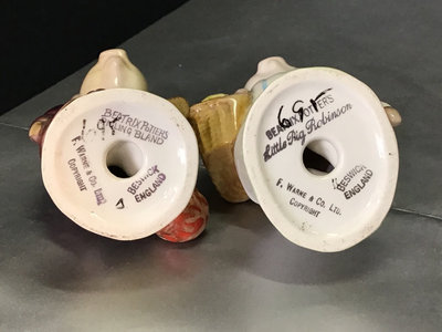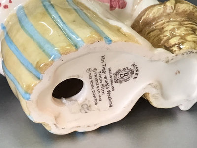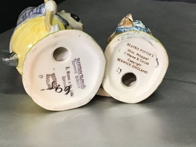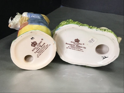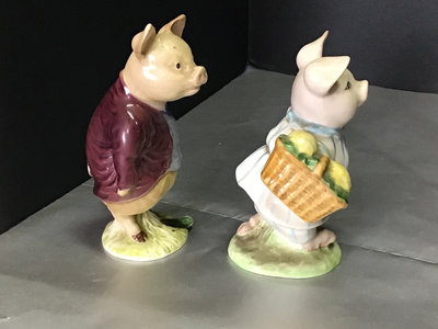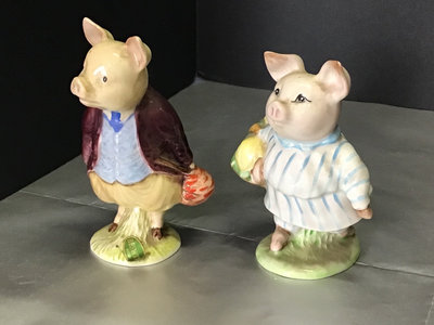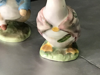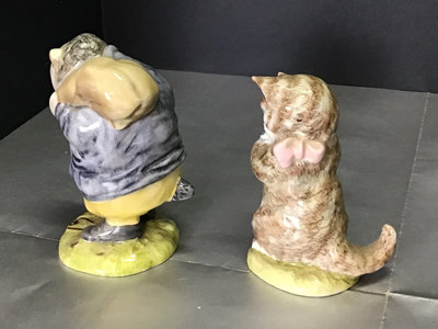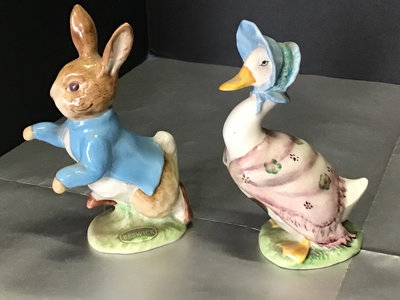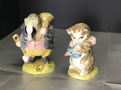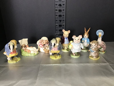 Vintage Beatrix Potter ceramic figurines. Royal Albert Benjamin Wakes Up 2.5h and Tommy Brock 3.5h. Royal Doulton / Beswick Mrs. Tiggly-winkle Washing 3h. Beswick Tommy Brock 3.5h, Miss Moppet 3h, Pigling Bland 4h, Little Pig Robinson 3.75h, Peter Rabbit 4.5h, and Jemima Puddleduck 4.25h. Made in England. 9 pieces.