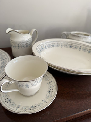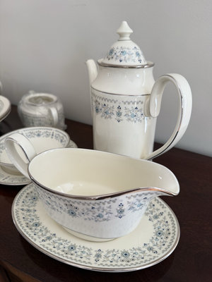 A Beaumaris pattern Minton fine bone china service for 12, including dinner plates, oval platter, bowls, teapot with lid, creamer, sugar pot with lid, cups and saucers, and a gravy boat.