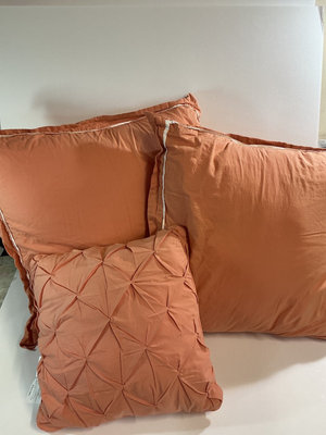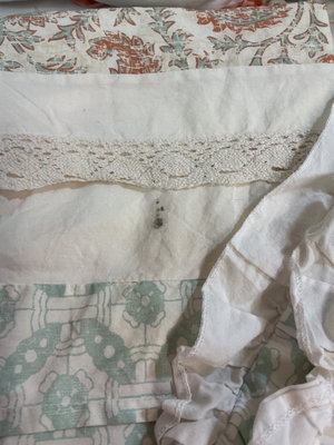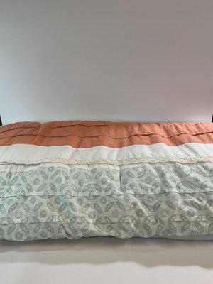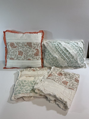 A collection of bed linens including a quilted comforter with mint-green floral pattern and orange trim, two decorative pillows/shams featuring floral and striped designs, and folded quilts with lace trim.Matching throw pillows and euro shams. Queen