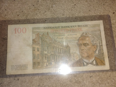 Two Belgian banknotes, one labeled 100 and the other CENT FRANCS, issued by the National Bank of Belgium, featuring portraits.