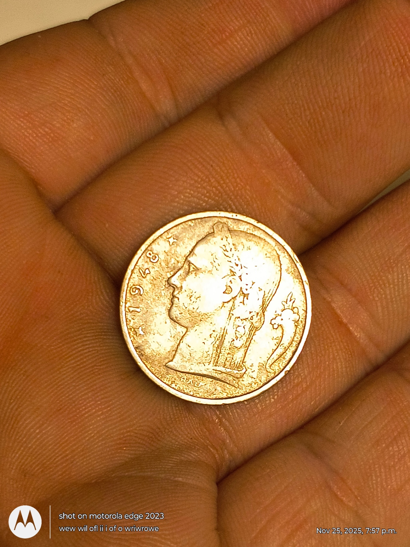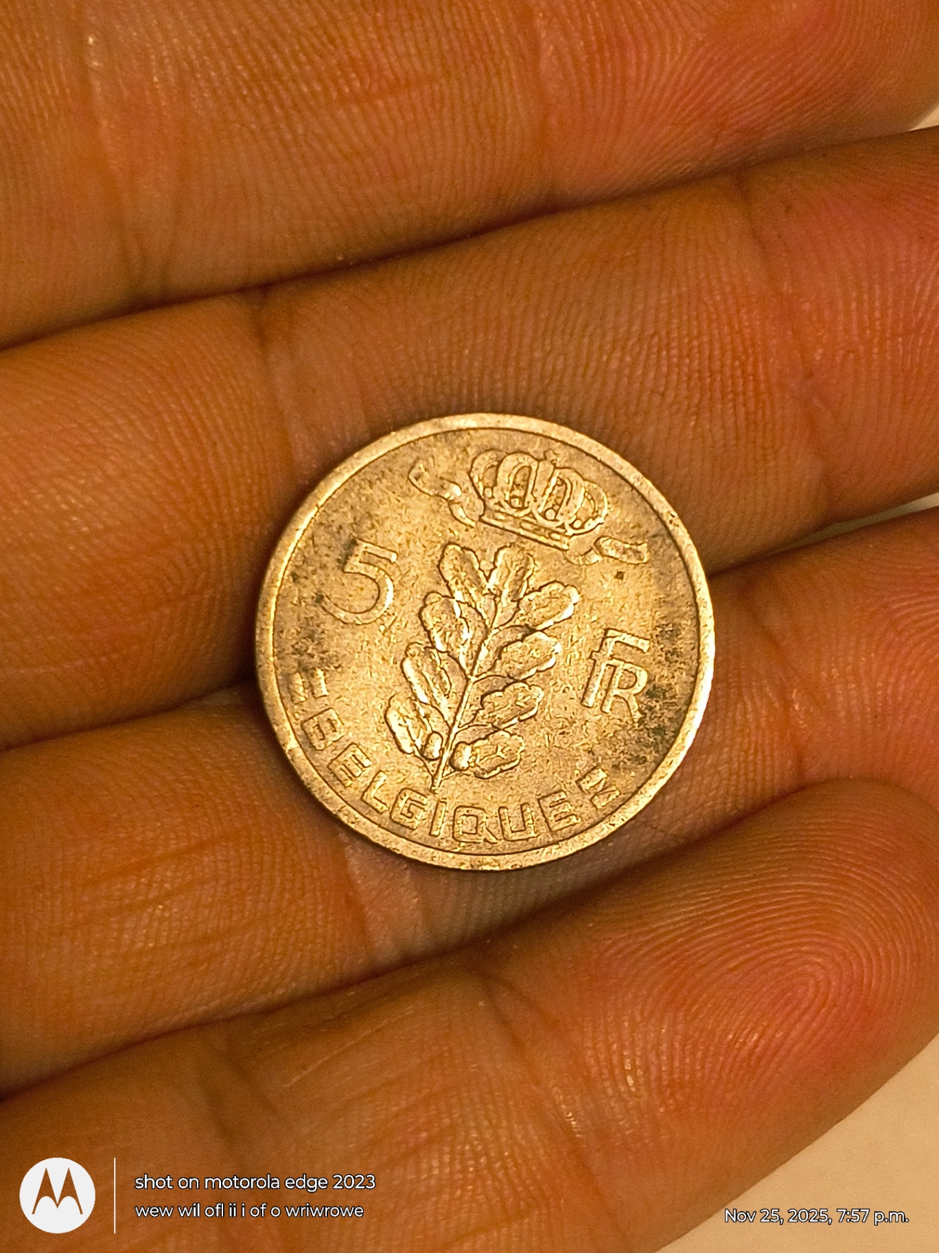 Belgian 5 franc coins. One side features a crown above a laurel branch with the denomination 5 FR and the word BELGIQUE; the opposite side shows a left-facing portrait with the year 1956.