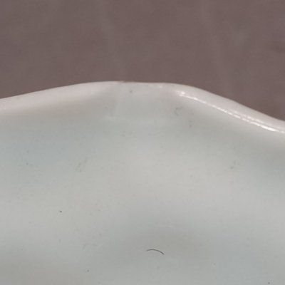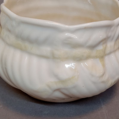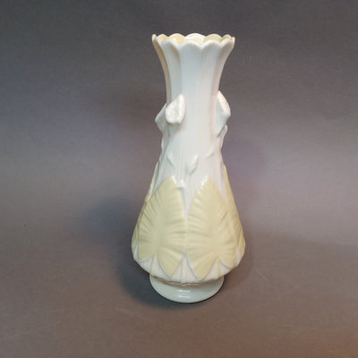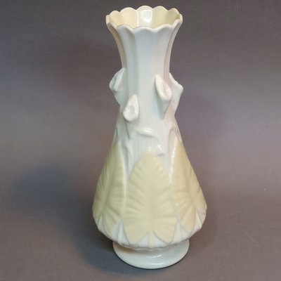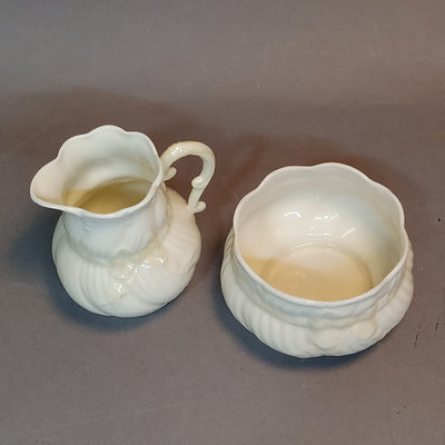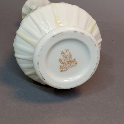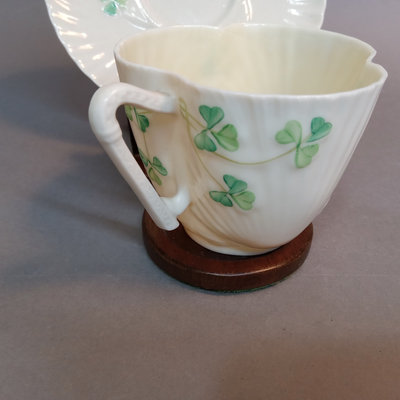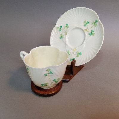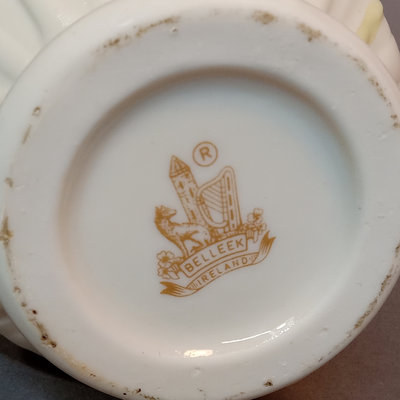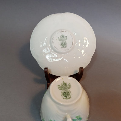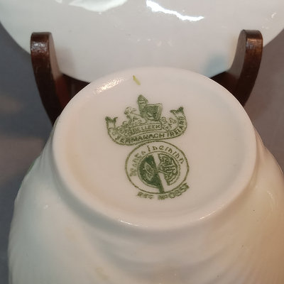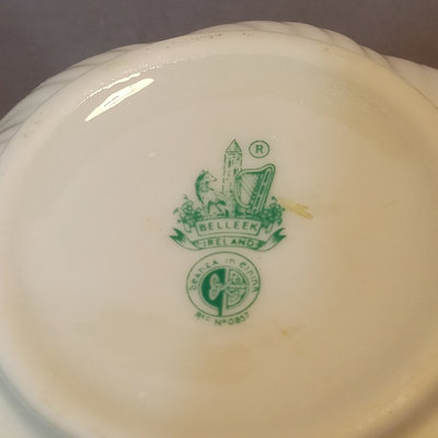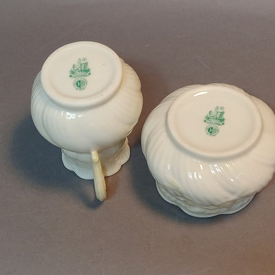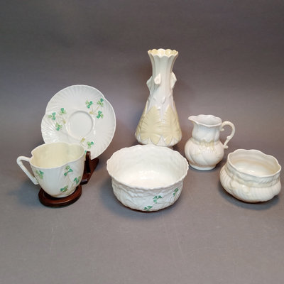 Belleek porcelain, made in Fermanagh Ireland. Harp Shamrock 2.5h cup and 5d saucer, green 5th mark (1946-1955). Shamrock bowl, purple 8th mark, 4.5d x 2.25h. Nile Calla Lily bud vase, 7th mark, 7.25h. Ribbon 3.5h creamer and 2.25h sugar bowl, green 6th mark. 6 pieces.