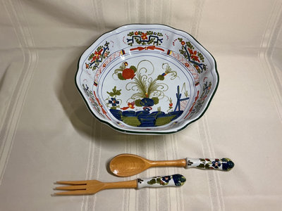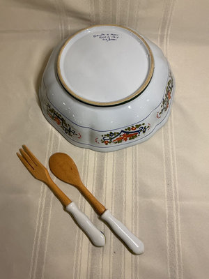 A collection of hand-painted Italian ceramic kitchen items including a large scalloped bowl, a matching cruet pair with long spouts on a decorative tray, a salt and pepper shaker pair, a small matching condiment bottle, and two wooden-handled utensils with ceramic floral handles. Biordi Art Imports specializes in authentic, heirloom-quality Italian ceramics, particularly hand-painted majolica pottery from regions like Deruta, Siena, and Florence. The pieces are handcrafted and hand-painted by Italian artisans using traditional methods and techniques, making each item unique. check out their website as these items retail for a LOT of $$. https://biordi.com/?srsltid=AfmBOookYK1VOFNldQfFhXUq15ZYDj5Glq7Td3Ukx2a4Y8j7R8daRvyB