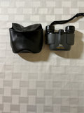 A collection of bird-themed decorative items including metal bird silhouettes, small ceramic bird ornaments with colored ribbons, a carved bird sculpture, plus wildlife reference books and a pair of 8x binoculars with a leather carrying case.