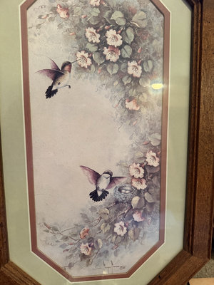 A collection of bird-themed decorative items including multiple framed prints of songbirds and hummingbirds, a large round wooden clock featuring bird illustrations, a small carved wooden clock with a botanical motif, an octagonal framed bird print, a tall rectangular bird-and-flower print, and a landscape postcard.