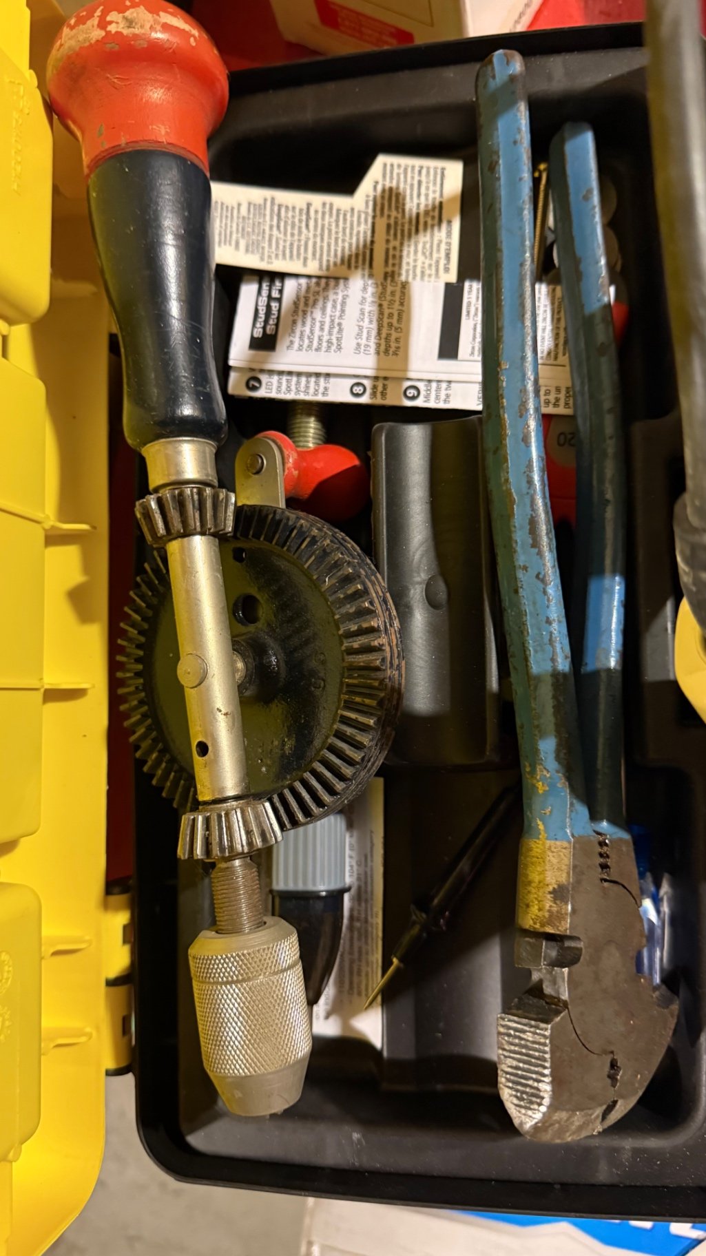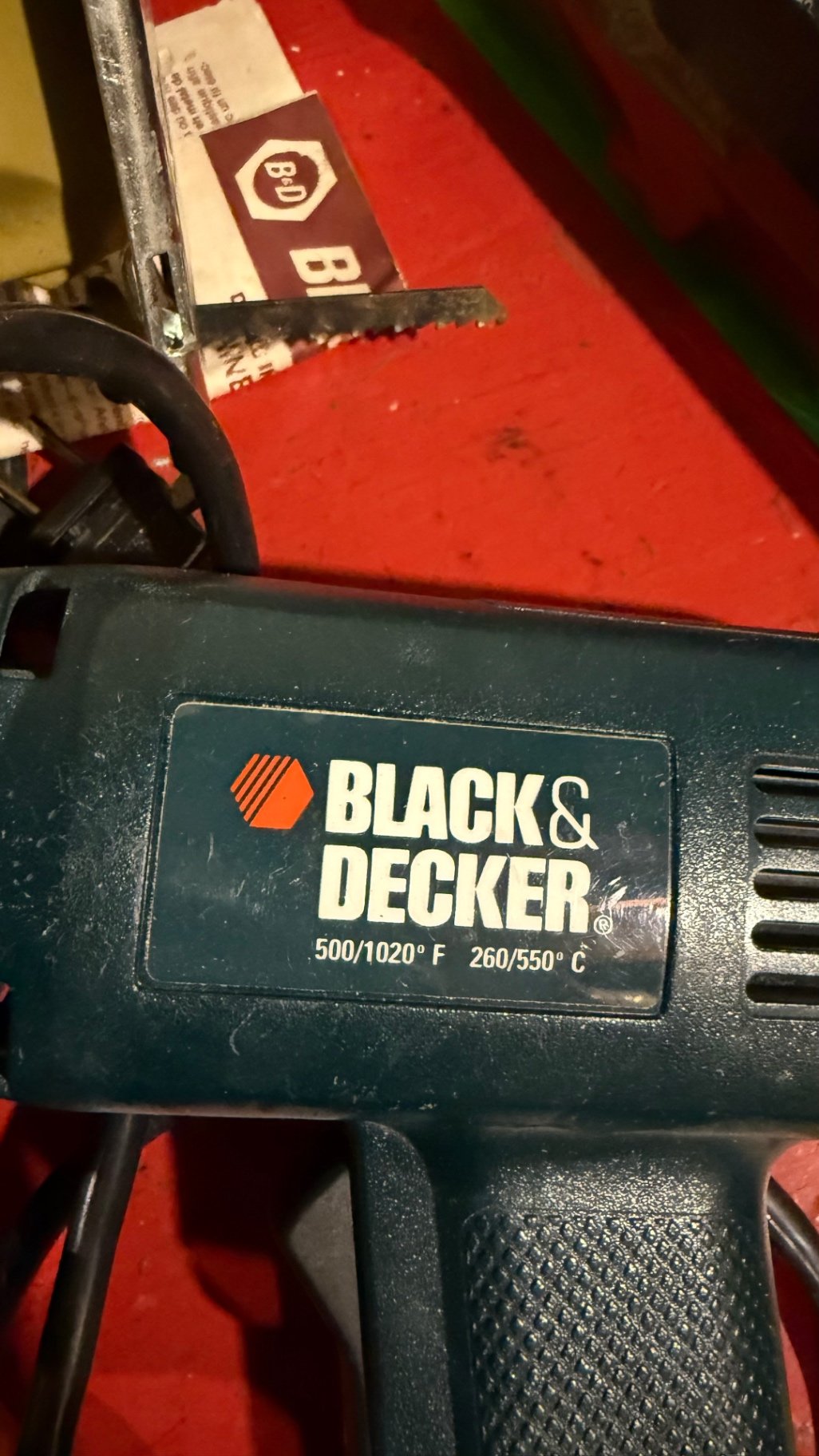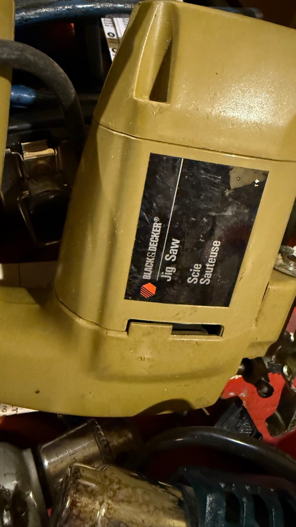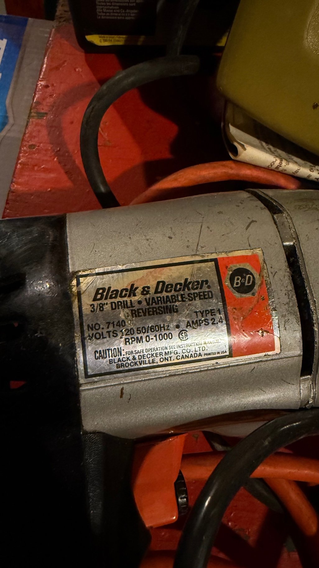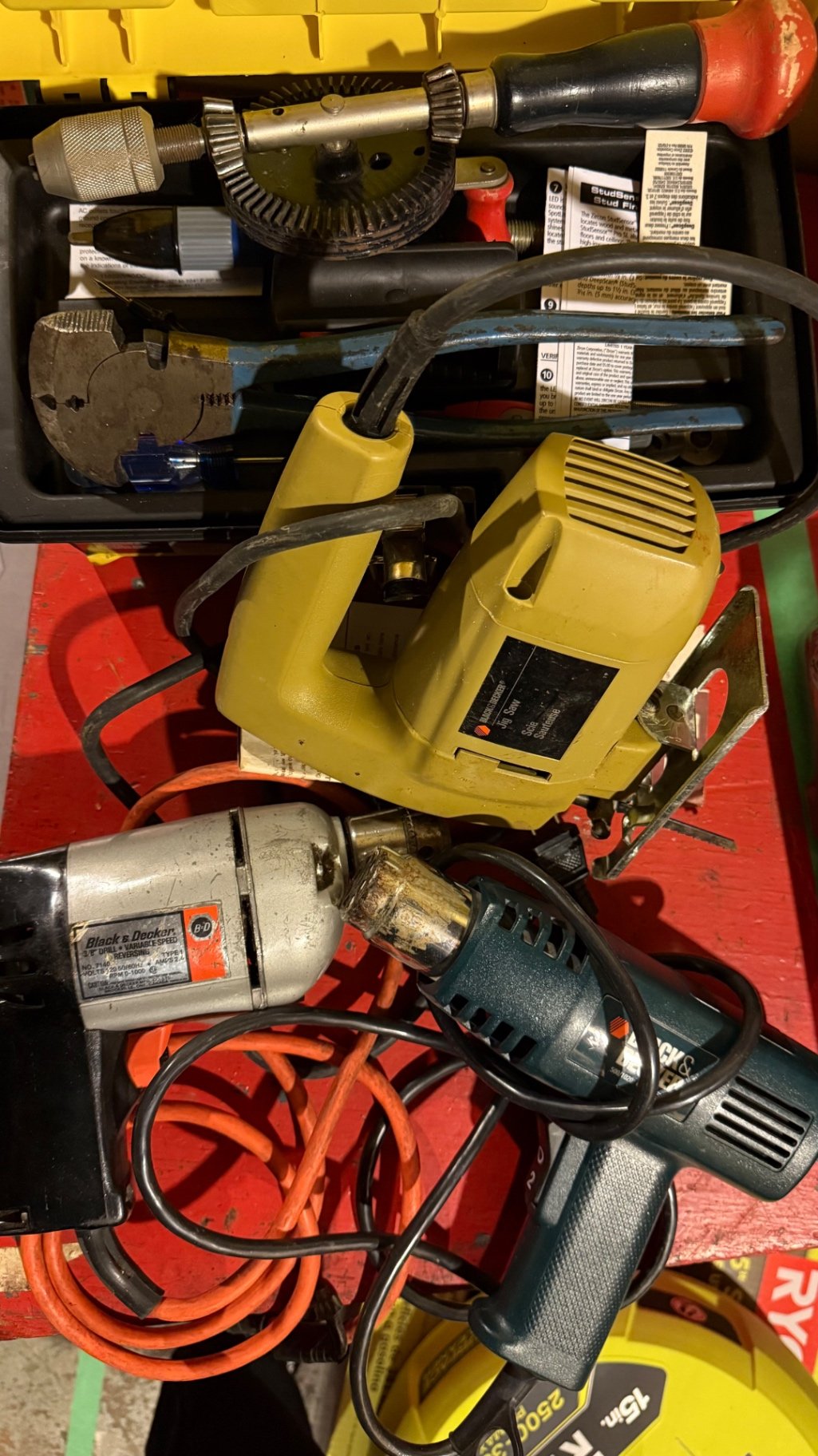 A collection of Black & Decker power tools including a 3/8-inch drill with variable speed, a jig saw, and a grinder/rotary tool, along with cords and attachments, all stored together in a toolbox. UNTESTED, as is as found. ** BRING OWN PACKING MATERIALS
