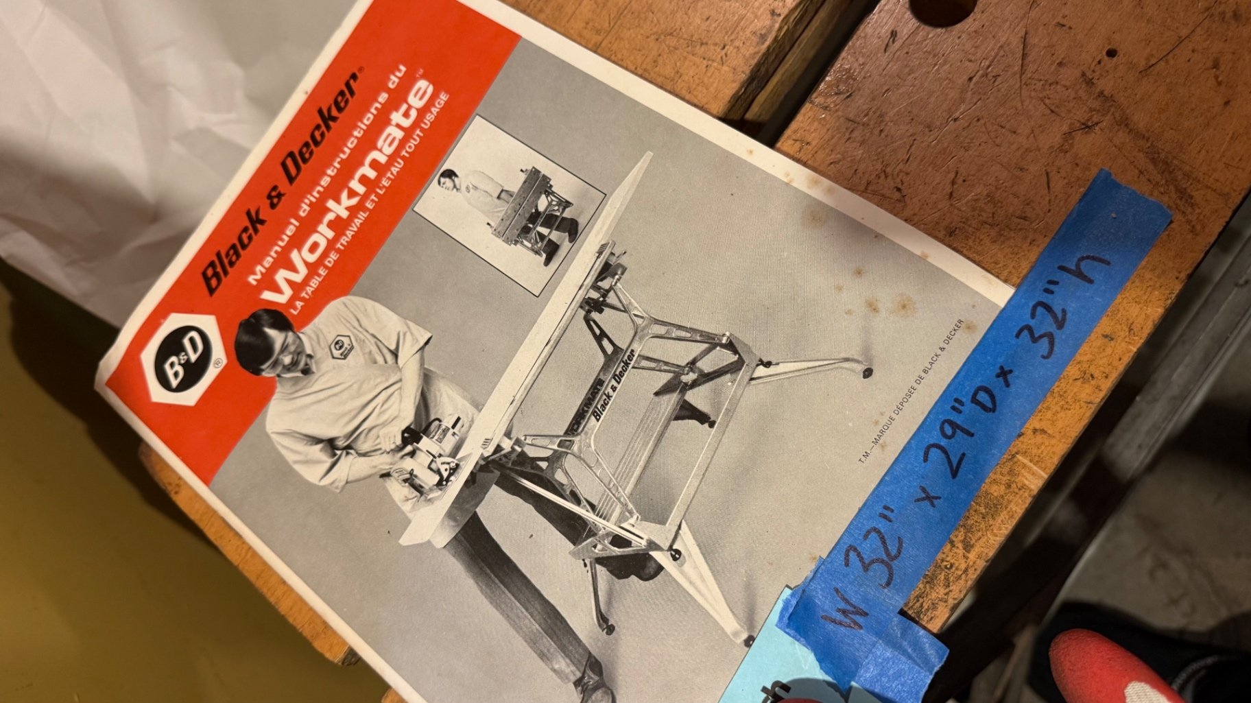 A Black & Decker Workmate portable workbench with a wooden top and metal frame, dimensions approximately 32 inches wide by 29 inches deep by 32 inches high, with accompanying manuals/brochures. ** BRING HELP TO MOVE OUT OF BASEMENT