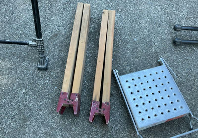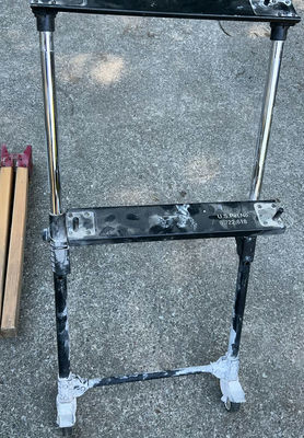 A Black & Decker Workmate Deluxe Dual Height workbench with wooden clamping jaws, accompanied by a rolling metal tool stand, a folding perforated metal step stool, additional support stand components, and wooden attachment pieces.