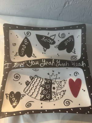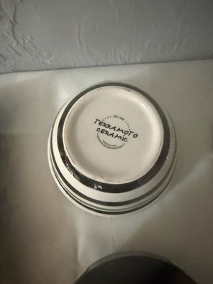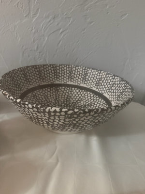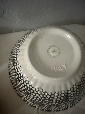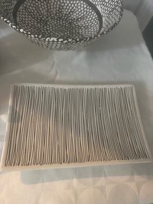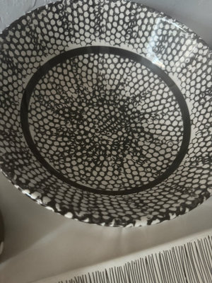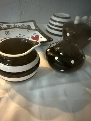 A collection of black-and-white ceramic kitchen items including a large speckled bowl, a striped striped bowl, a small lidded jar, a striped mug, a black domed container with white dots, a rectangular striped tray, and decorative plates with graphic designs.
