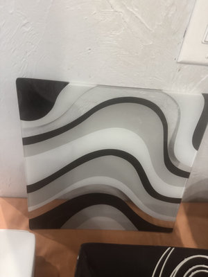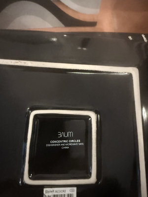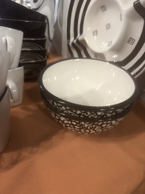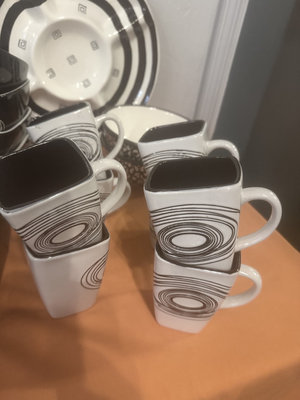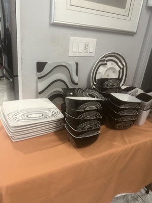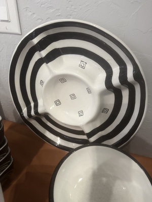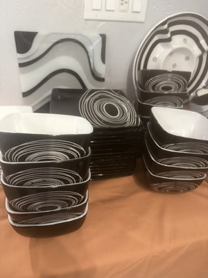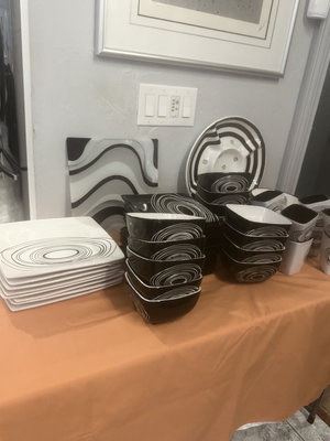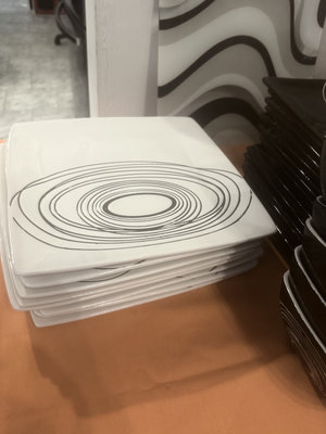 A collection of ceramic dinnerware in black and white with concentric circle designs, including square and round plates, bowls, mugs, a large serving bowl, and a decorative platter.