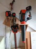 A collection of Black+Decker cordless power tools and accessories, with 60V MAX battery. Includes a hedge trimmer, a leaf blower/vac, a pole saw, extra battery pack, and a charger. Tested