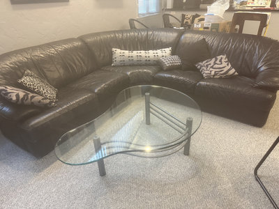Black Leather Curved Sectional Sofa with Throw Pillows and Glass Coffee Table