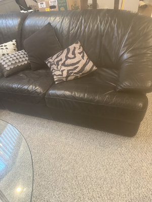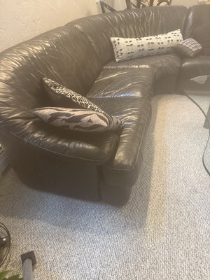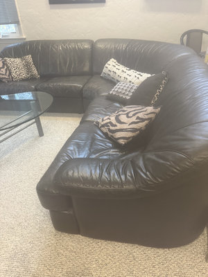 A black leather curved sectional sofa with multiple decorative throw pillows 54x54x58 curve