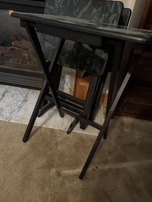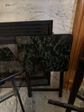 Group of folding tables with black metal frames and rectangular green marble-pattern laminate tops; the pieces appear to be multiple matching tables that can fold and be stored together.