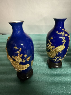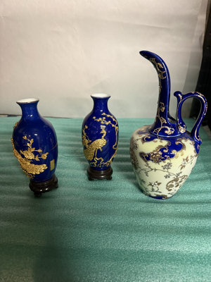 Three porcelain pieces: two cobalt-blue vases with gold relief of flowers and birds on small dark stands, and a blue-and-white porcelain ewer with a tall curved neck and decorative handle, all featuring gold detailing.