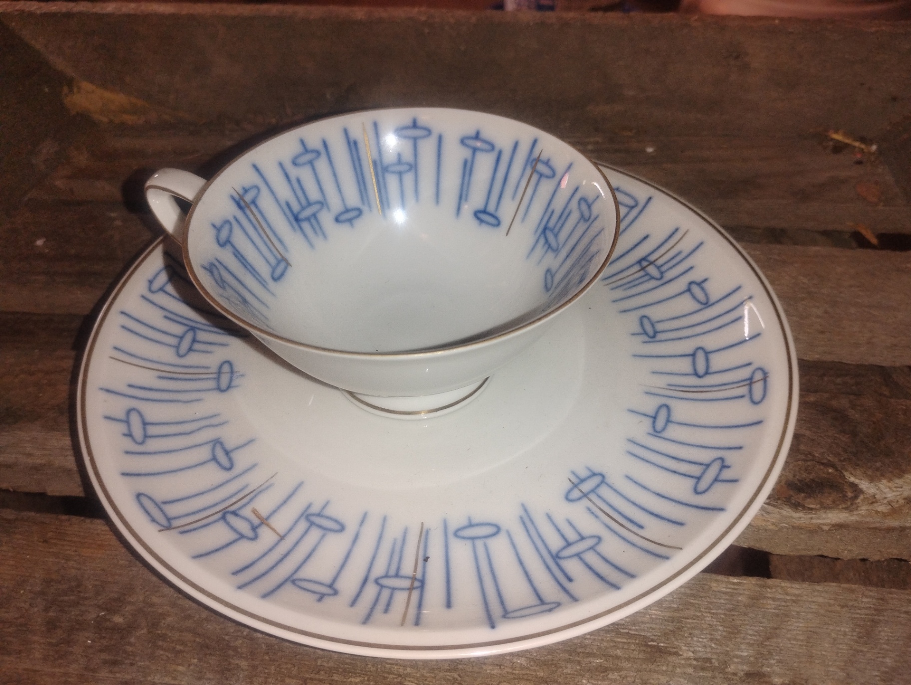 Porcelain teacup with a matching saucer resting on a large white plate, all featuring a blue linear geometric pattern.