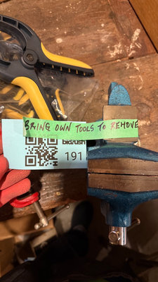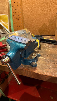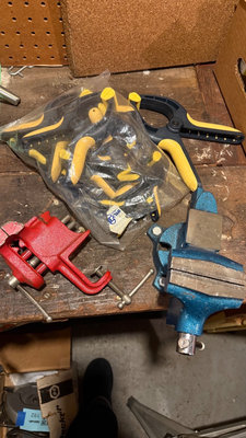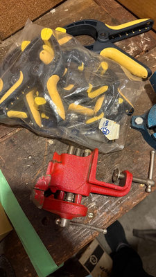 Blue bench vise, red mini vise, yellow-handled clamps and grips in a bag, and other small clamps and hardware pieces. As is as found. Please bring tools to remove blue clamp from bench. ** BRING OWN PACKING MATERIALS
