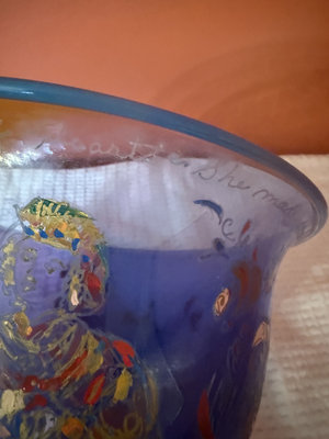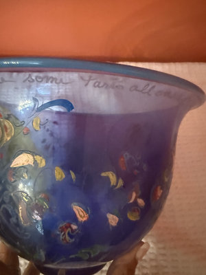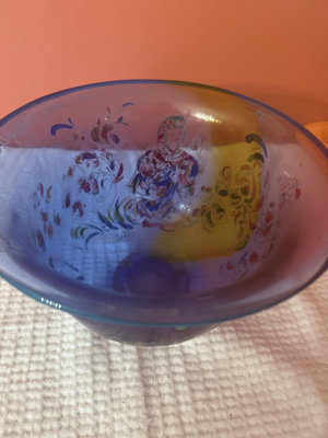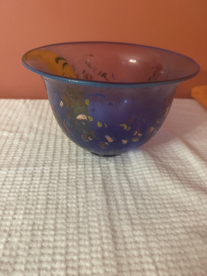A cobalt blue glass bowl with multicolored hand-painted floral and figurative designs on both the interior and exterior surfaces.