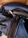 Blue Mizuno gear bag/backpack with multiple zippered compartments, adjustable straps, and carrying handles.