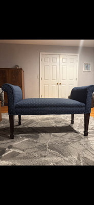 A blue upholstered chaise lounge with rolled arms, a small diamond pattern, and dark wooden legs.