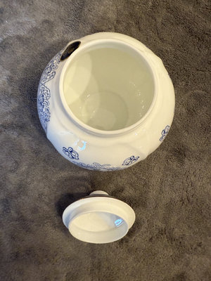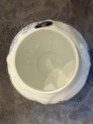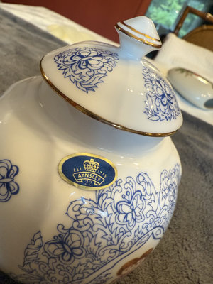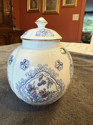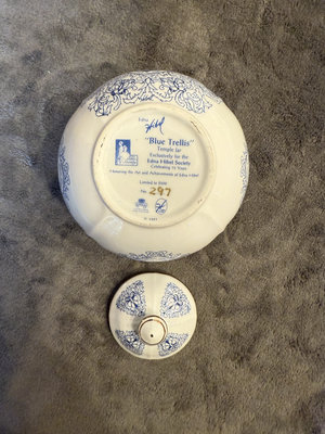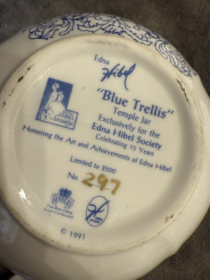 White porcelain temple jar with blue underglaze floral trellis designs on the body and lid, featuring a small knob lid with gilded trim. Base markings indicate it is the 'Blue Trellis' Temple Jar, Exclusively for the Edna Hibel Society, celebrating 15 years, Limited to 2500, No. 297, 1991, with Aynsley Fine Bone China Made in England and Hibel Studio insignia. 61/2" high