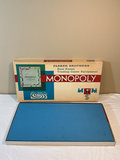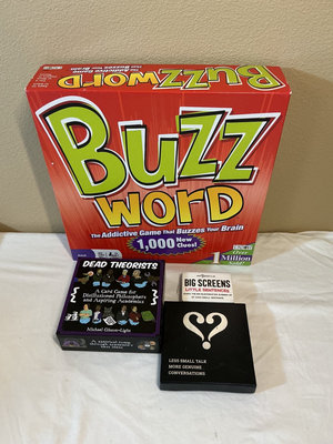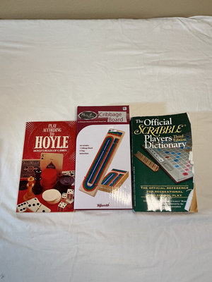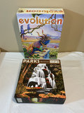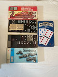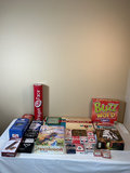 A collection of board games, card games, dominoes, cribbage boards, a card shuffler, playing cards, domino sets, and several 1000-piece Springbok jigsaw puzzles including Monopoly, Dragon Dominoes, Evolution, Parks, and Buzz Word.