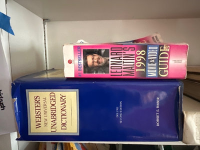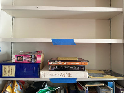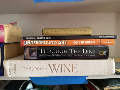 A mixed assortment of books including a blue Webster's Unabridged Dictionary, titles on art and photography (Underground Art, Through The Lens, Images of Labor), The Joys of Wine, a mountain guide, and a guitar instructional book with a related disc.