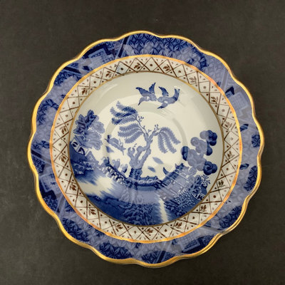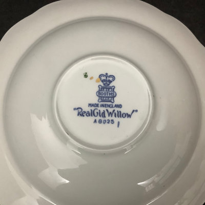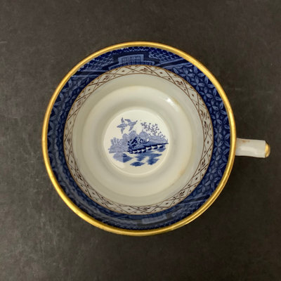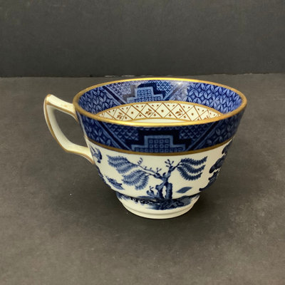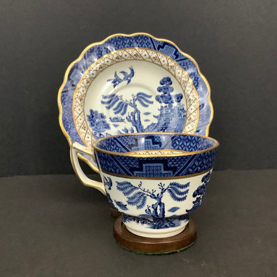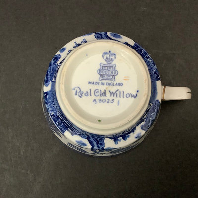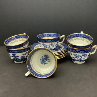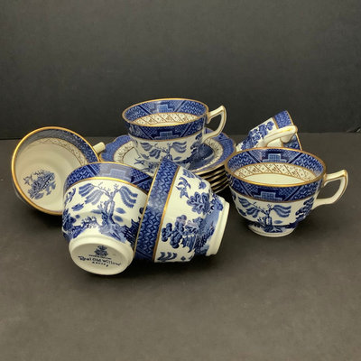 Booths Real Old Willow A8025 blue and white with gold rim teacups and saucers. Saucers 5.75d, teacups 3.5dx2.75h. Set of 6. 12 pieces.