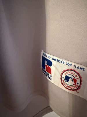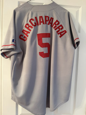Gray Boston Red Sox baseball jersey with red 'BOSTON' lettering across the chest and 'GARCIAPARRA' with the number 5 on the back; features official team patch and a size label.