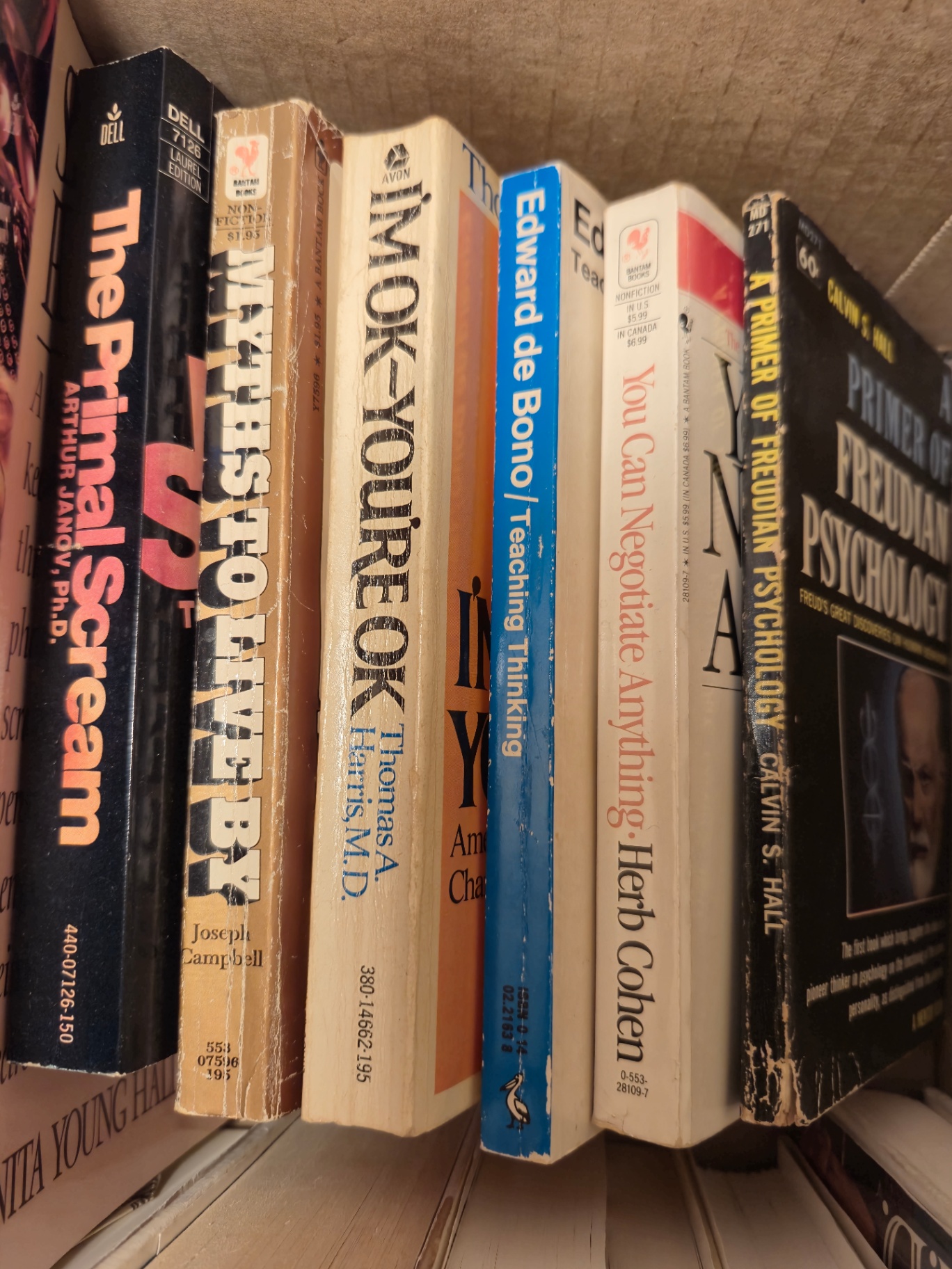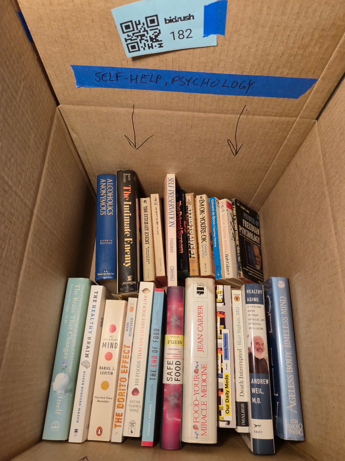 A cardboard box containing a varied collection of psychology, health, and self-help books in multiple editions and sizes.