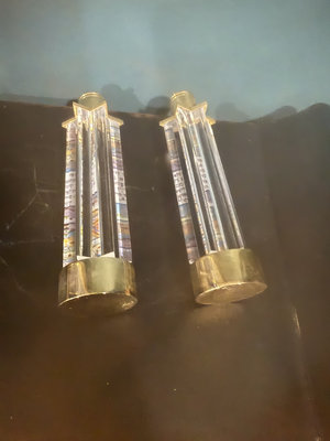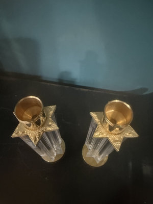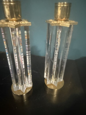 Pair of vintage brass and clear glass column candle holders featuring vertical glass prisms, star-shaped brass tops, and round brass bases.