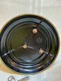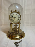Brass mantel clock with Roman numeral dial and floral wreath motif, displayed under a glass dome. Includes a winding key. Pendulum mechanism is disconnected. Made in Germany.