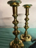 A pair of brass candlesticks and two dark metal giraffe figurines with star-shaped cutouts.