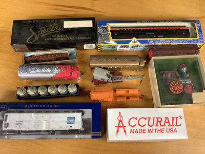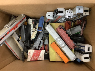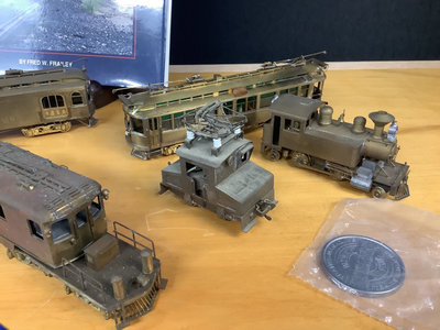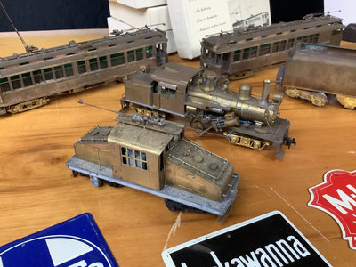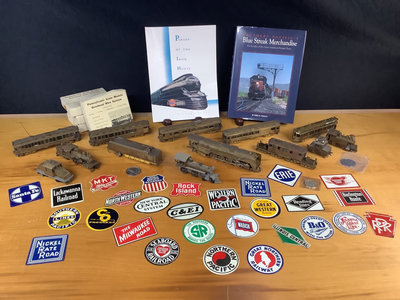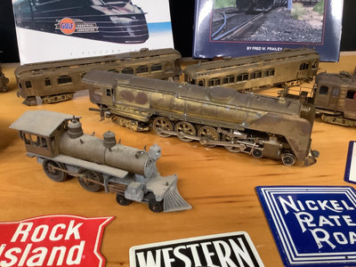 Lots includes 13 brass trains, and literature. Collectible tin railroad signs. 50+ additional plastic HO scale trains and cars. No track. 50 plus pieces.
