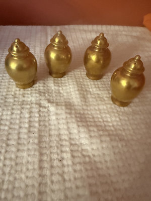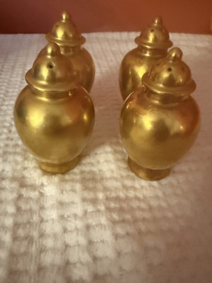 Four small brass salt and pepper shakers with rounded bodies and dome-shaped lids; each lid has small holes for dispensing.