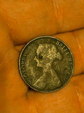 toned worn British coins. One features a left-facing profile of Queen Victoria with inscriptions around the edge; the other shows a seated Britannia figure and the inscription HALF PENNY with a date at the bottom.