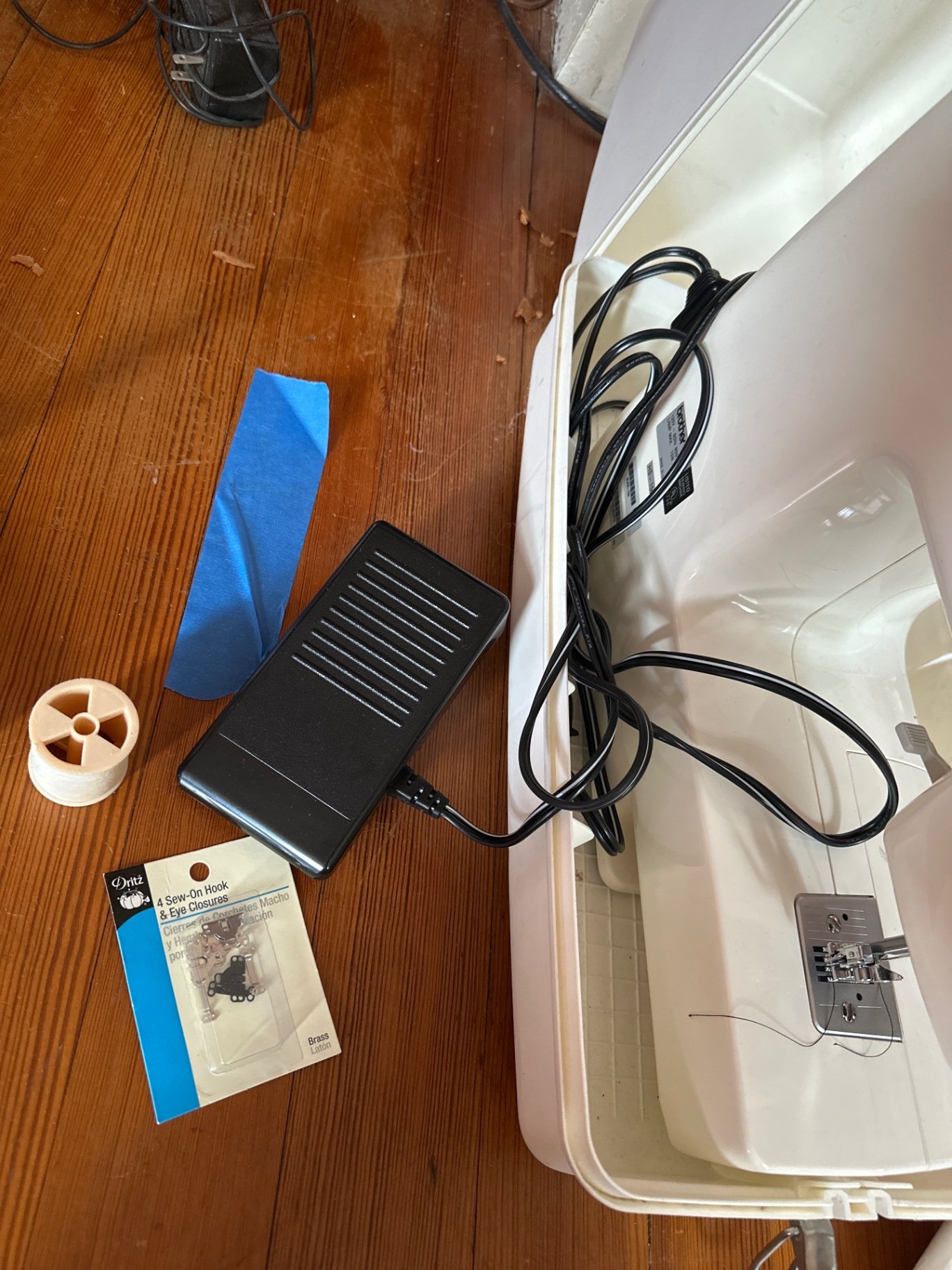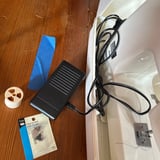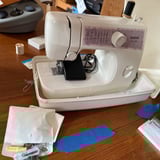 A compact Brother sewing machine (HS-150) in a carrying case with foot pedal, along with sewing notions such as a bobbin, spool, needle kit, instruction manual, and a wooden measuring ruler.