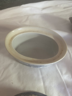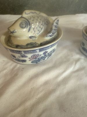 A collection of ceramic kitchenware including two brown-glazed jars with lids, a brown-handled pot, and a blue-and-white porcelain dish with a koi-fish lid. The pieces feature floral and geometric designs with a glaze contrast, and a maker's mark is visible on the bottom.