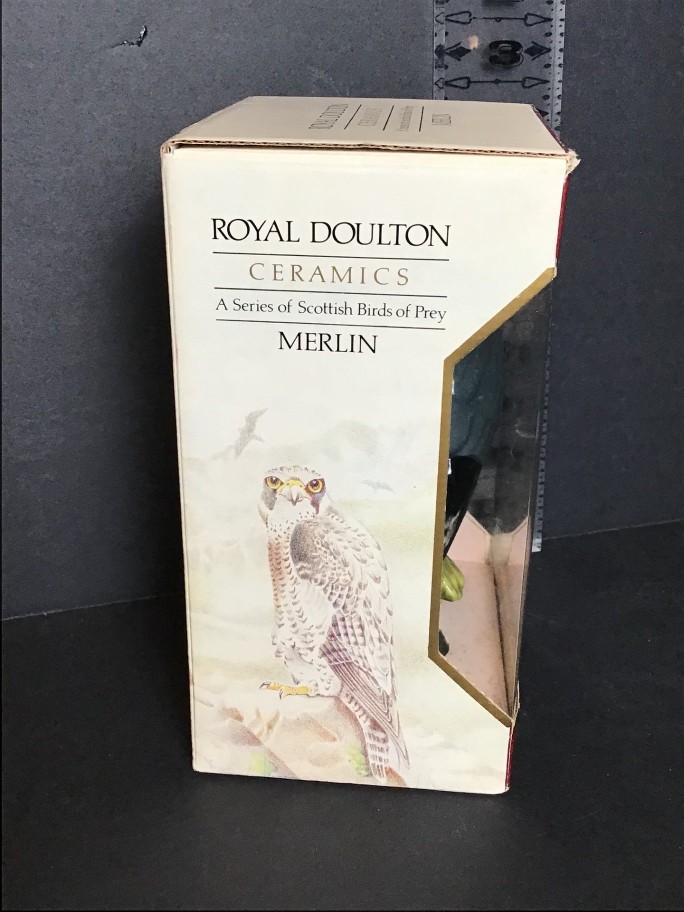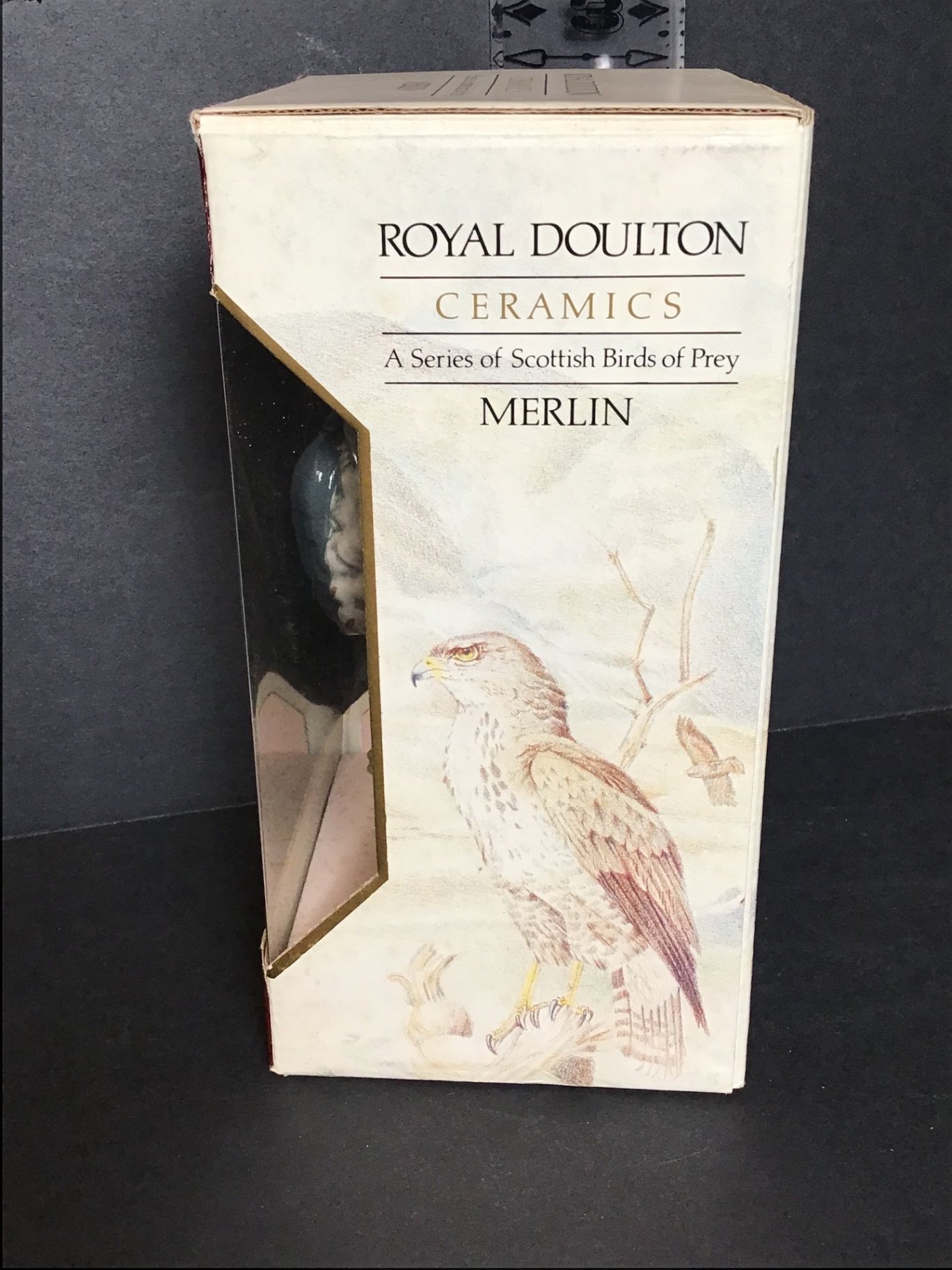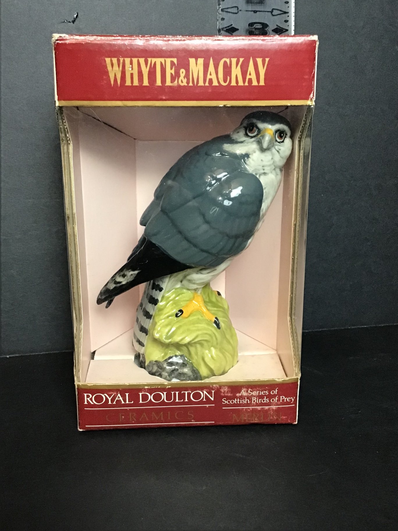Burslem Royal Doulton Merlin ceramic 200ml Scotch Whiskey bottle in original box, from the Scottish Birds of Prey collection for Whyte & Mackay, designed by John G. Tongue 1979. Light foxing / mildew in bottom of box from storage. 1 piece.