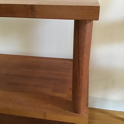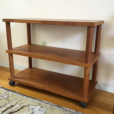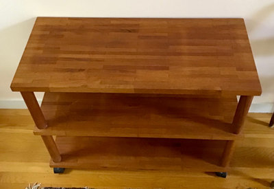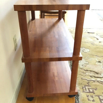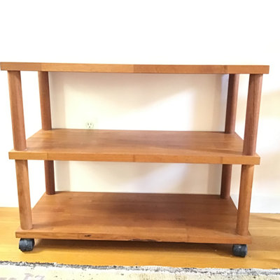 Butcher block style shelf, solid wood with plastic wheels that lock, 36x15.5x29. Heavy, bring help and appropriate vehicle to pickup. 1 piece.
