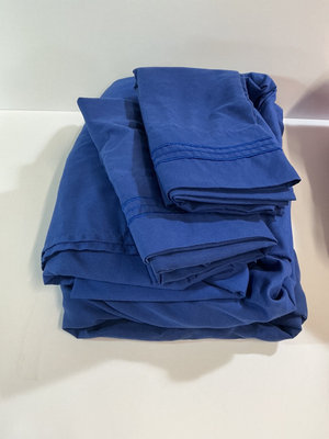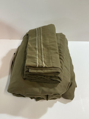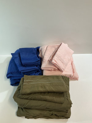 Three sets of soft CAL King size sheets: olive green, royal blue, and light pink, each featuring decorative stitching along the hems.