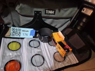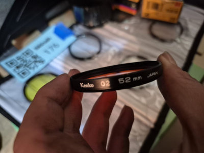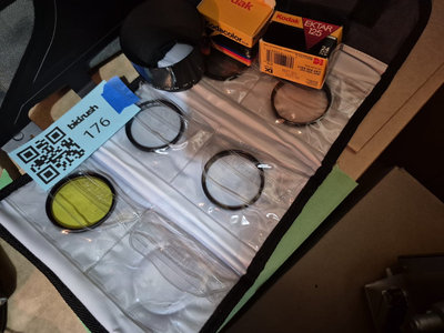 A collection of photography accessories comprising circular camera filters stored in a wallet-like case, a Kenko 52 mm filter ring, and several Kodak color film boxes. UNTESTED, as is as found. ** BRING OWN PACKING MATERIALS