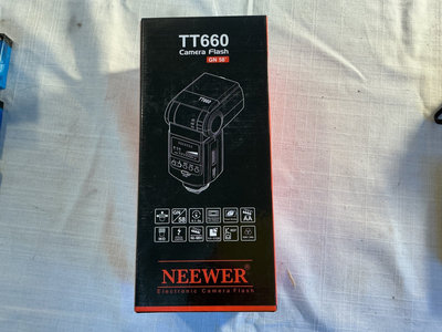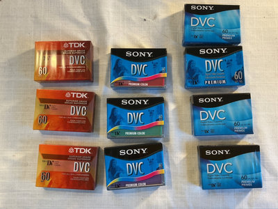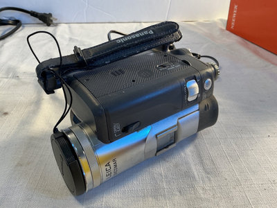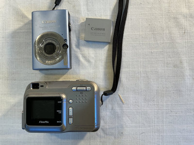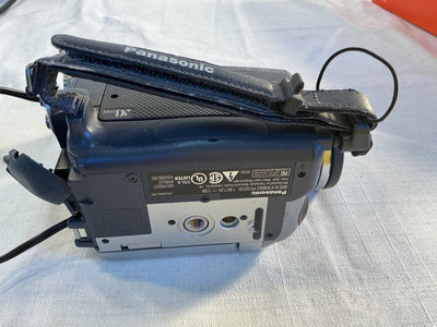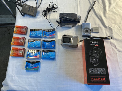 Photography and video equipment - includes a Panasonic handheld camcorder, a Fuji FinePix digital camera, a Canon compact camera with battery pack, a Neewer camera flash, and multiple DVC tapes.