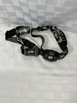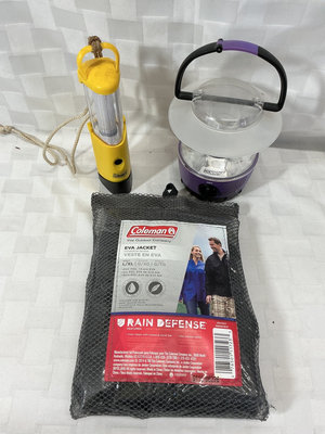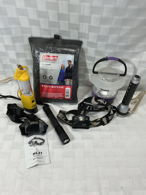 Collection of outdoor lighting equipment including two headlamps, multiple flashlights and lanterns, plus a Coleman Eva Jacket packaged in a mesh bag.