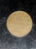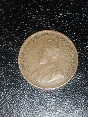 A 1933 Canadian one-cent coin featuring a portrait of King George V on the obverse and maple leaves motifs on the reverse.