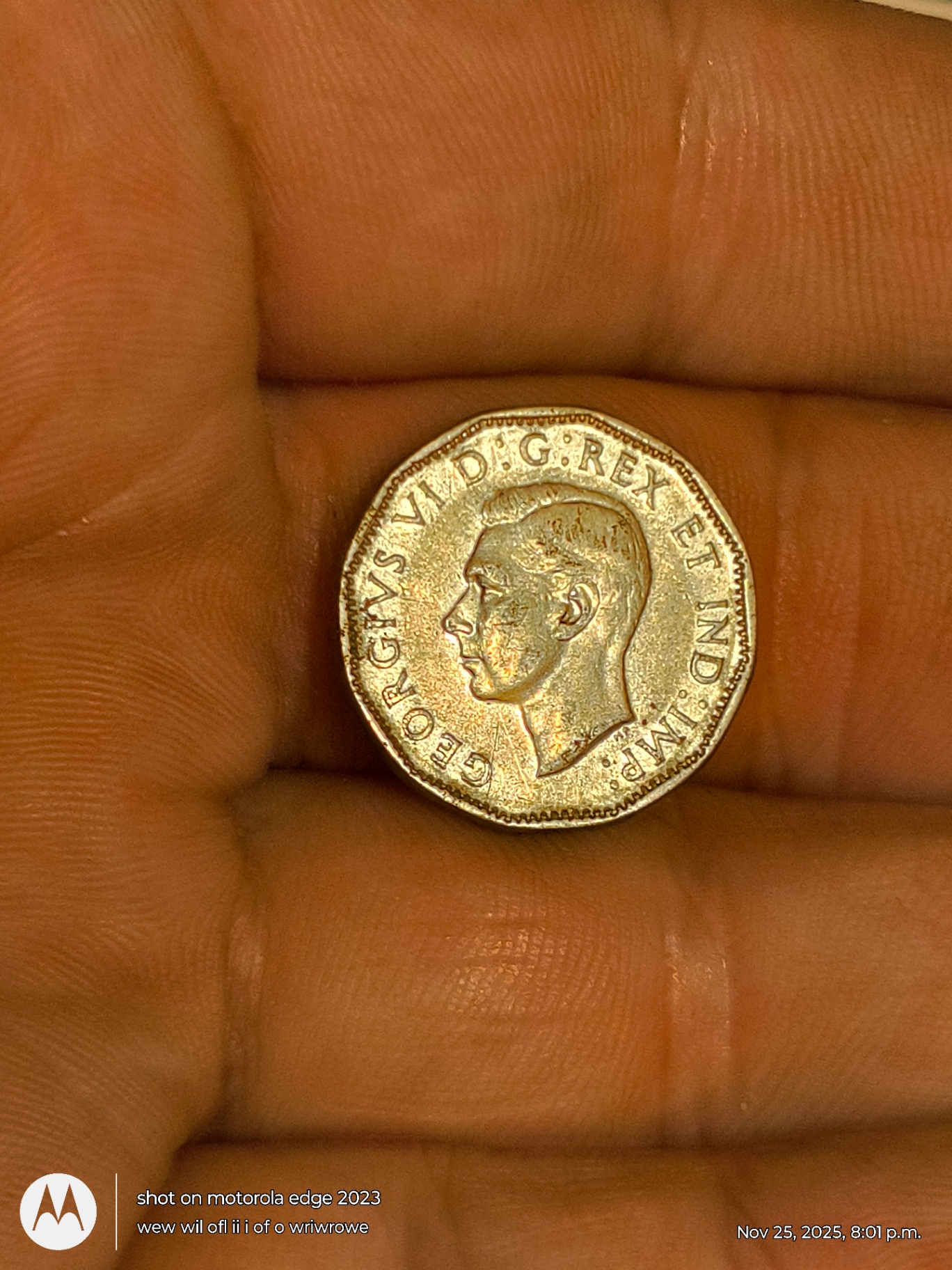 Two coins: a 1945 Canadian five-cent piece featuring a torch with maple leaves and the words CANADA CENTS; and a coin with a profile portrait of King George VI and surrounding inscriptions from the George VI era.