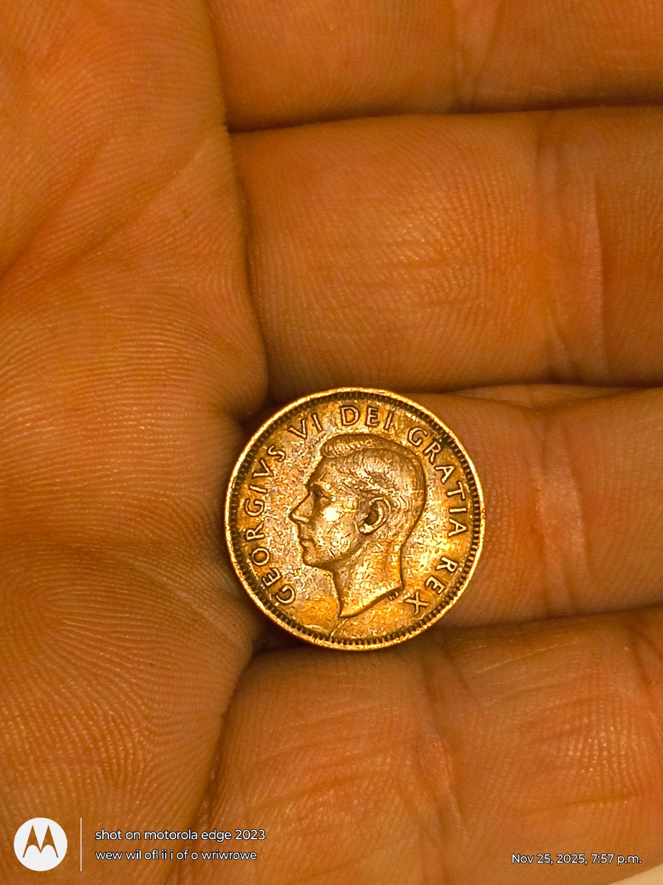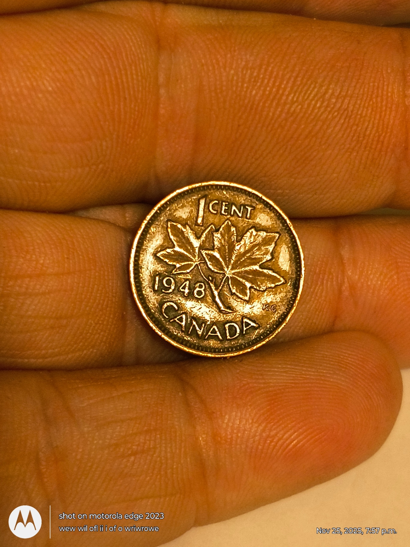 Two Canadian one-cent coins from 1948, featuring a maple leaf on the reverse side.